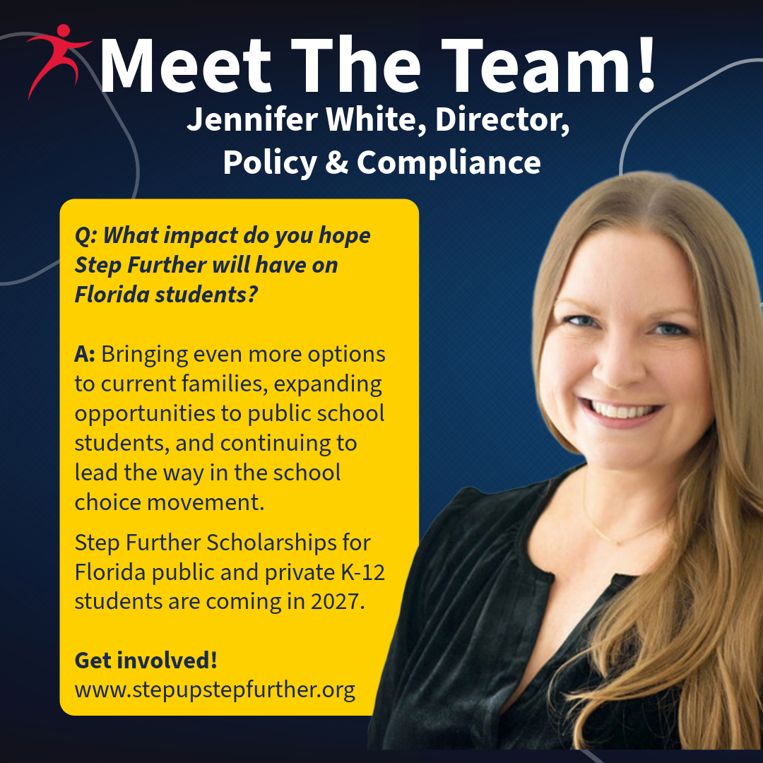 El impacto real empieza con personas reales. Te presentamos a Jen, directora de Políticas y Cumplimiento Normativo. Jen es una líder apasionada que está al frente del fondo de becas «Step Up, Step Further », un equipo comprometido con abrir puertas y cambiar vidas a los estudiantes de primaria y secundaria de Florida.
